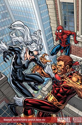 MARVEL ADVENTURES SPIDER-MAN #42 Written by MARC SUMERAK A night at the museum becomes a complete cat-astrophe when a feline femme fatale procures a priceless piece of Native American art. But the fur really begins to fly when the beautiful Black Cat is caught in the perilous pounce of the Puma! Looks like we've got ourselves a cat fight, Spidey... and you're caught in the middle! (Watch out for hairballs!) |