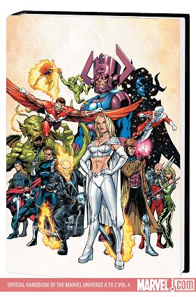 OFFICIAL HANDBOOK OF THE MARVEL UNIVERSE A TO Z VOL. 4 PREMIERE HC Written by JEFF CHRISTIANSEN, SEAN MCQUAID, DAVID WILTFONG, STUART VANDAL, RONALD BYRD, CHAD ANDERSON, MIKE FICHERA, JACOB ROUGEMONT, MADISON CARTER, MARK O'ENGLISH, MICHAEL HOSKIN, ERIC J. MOREELS, CHRIS BIGGS, GABE SHECHTER, AL Continuing the most exciting and comprehensive Marvel Handbook ever assembled! This twelve-volume guide to the Marvel Universe features more than 100 huge entries in each tome! This issue – from the Elf with a Gun to Guardians of the Galaxy! Spotlighting people (Eternity, Exodus, Falcon, Fin Fang Foom, Emma Frost, Nick Fury, Galactus, Gambit, two Ghost Riders, Gravity, Guardian), places (Genosha), teams (Excalibur, Exiles, Fantastic Four, Frightful Four, Generation X, the Great Lakes Initiative, the Hand), species (Eternals) and more!